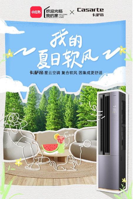 为了搭建品牌与用户之间真诚交流的桥梁,小红书以独具风格的家居生活场景IP「欢迎光临我的家」作为合作阵地,再次合作高端家电代表卡萨帝空调,并联合发起了#我的夏日软风主题活动。