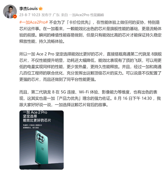性能上,一加Ace 2 Pro搭载了年度高口碑旗舰处理器第二代骁龙8移动平台。这款处理器采用台积电4nm旗舰制程工艺,性能大幅增强同时,耗电量大幅降低,也是目前安卓阵营性能最强的处理器。李杰提到“一加Ace 2 Pro不会为了「卡价位优先」,在性能体验上做任何的妥协,特别是芯片这件事。在一加看来,一颗能效比出色的芯片是旗舰性能的基础,更是流畅体验的前提。”