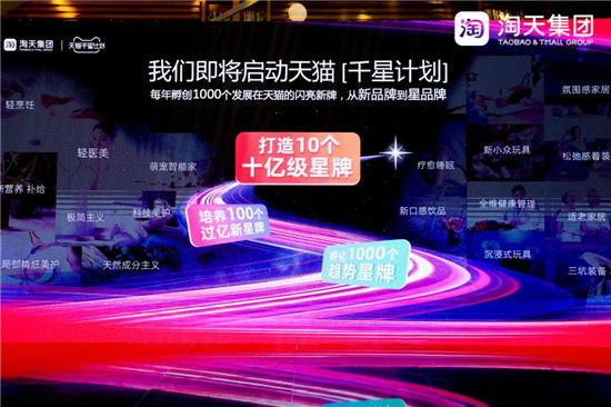 天猫“千星计划”将针对优秀成长型品牌的加速扶持,打造10个十亿级趋势星牌标杆,培养百大亿级明日新星牌,加速孵化千家趋势星牌,陪伴品牌创牌之路。