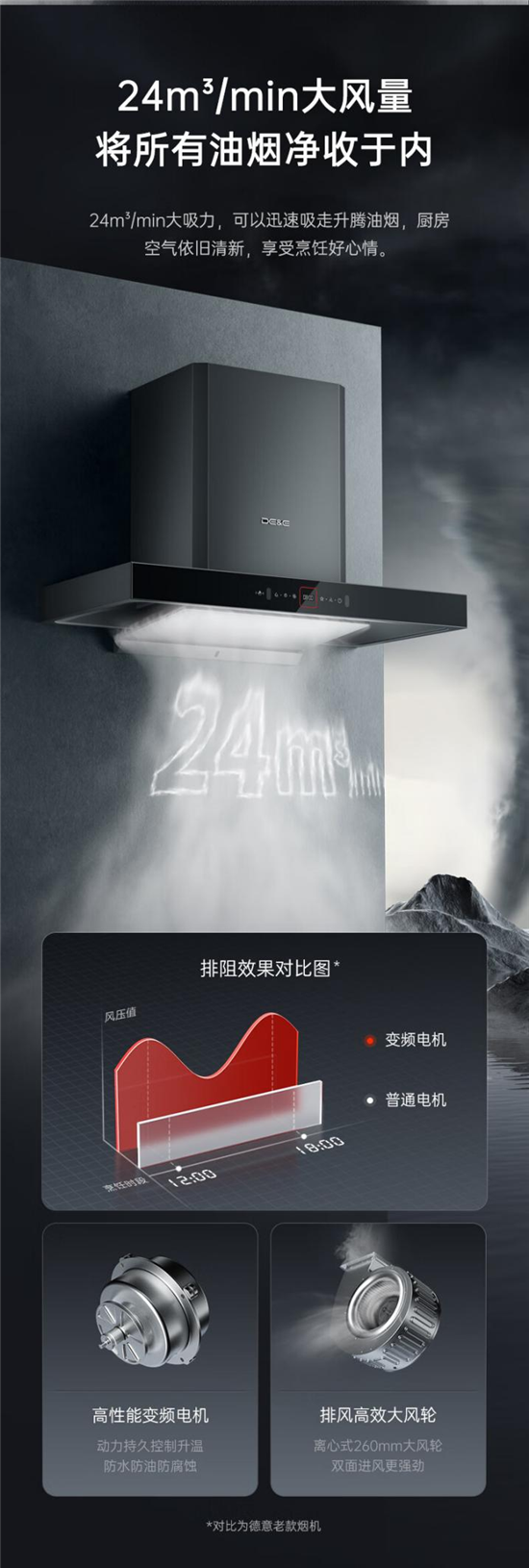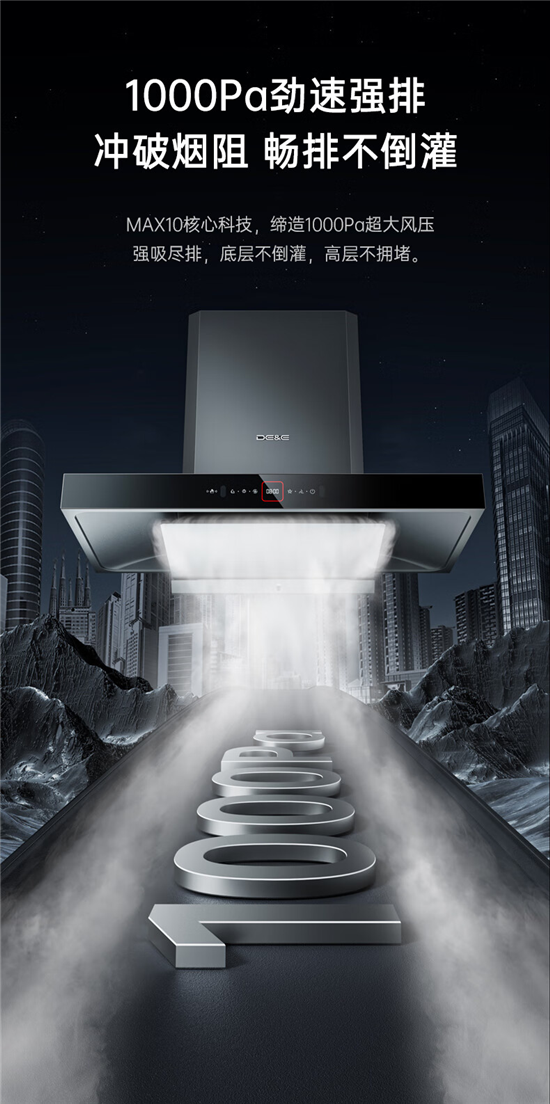 德意灰小T作为德意电器下半年的全新力作,采用全直流变频电机,可以根据公共烟道阻力自动调节风压的大小,最大风压可达1000Pa,一体式增压式蜗壳,导风排烟更顺畅,油烟不倒灌。