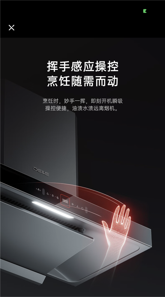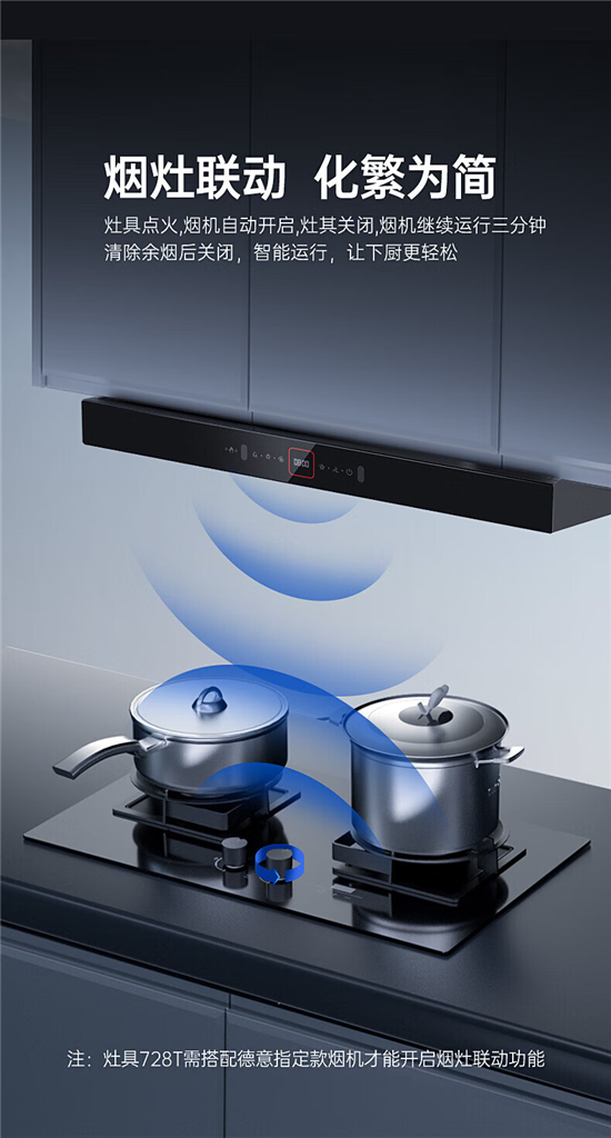 德意灰小T自带烟灶智慧联动功能,搭配德意5.2kW大火力的燃气灶即可实现烟灶联动,燃气灶开启后烟机自动开机运行,在油烟产生之前形成负压区域,有效避免漏烟跑烟现象的发生。