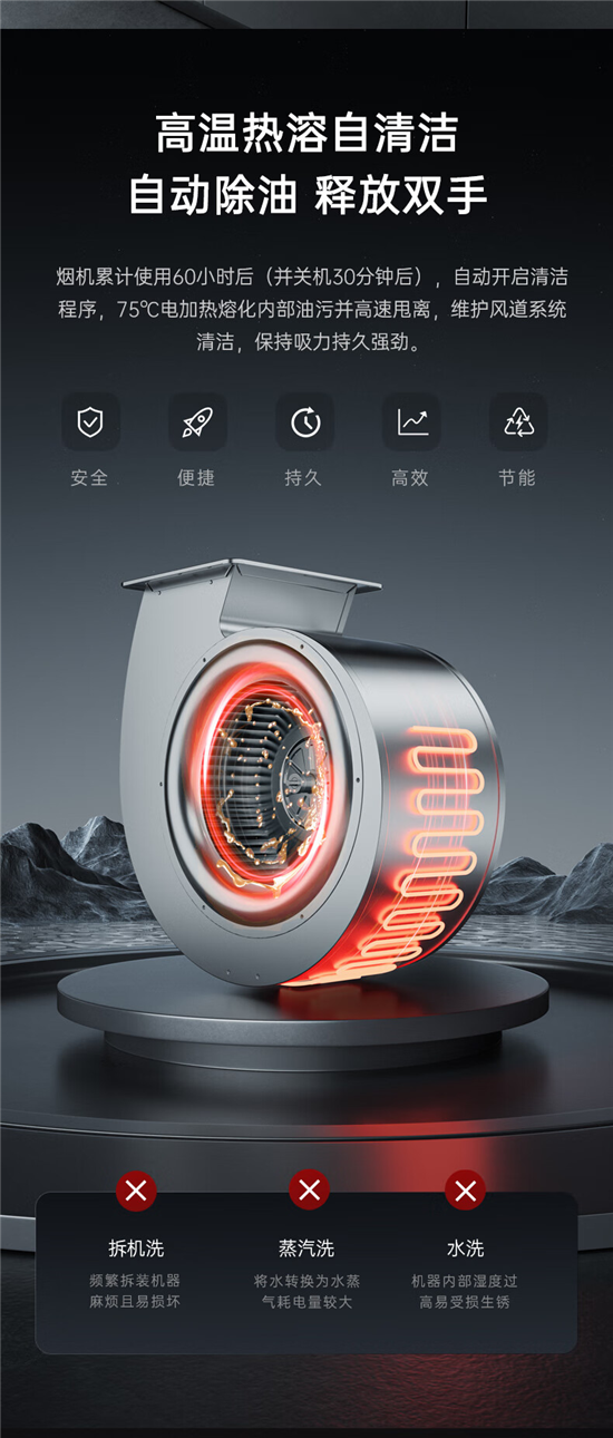 德意灰小T绝对是懂人心的,75℃高温自清洁,双重清洁模式,烟机累计使用60小时之后,烟机自动启动高温清洁功能,通过加热软化内部残留油污,流入油杯。同时还单独配备了清洁功能键,根据不同的使用习惯,用户可自由选择打开清洁功能,随时去油污。
