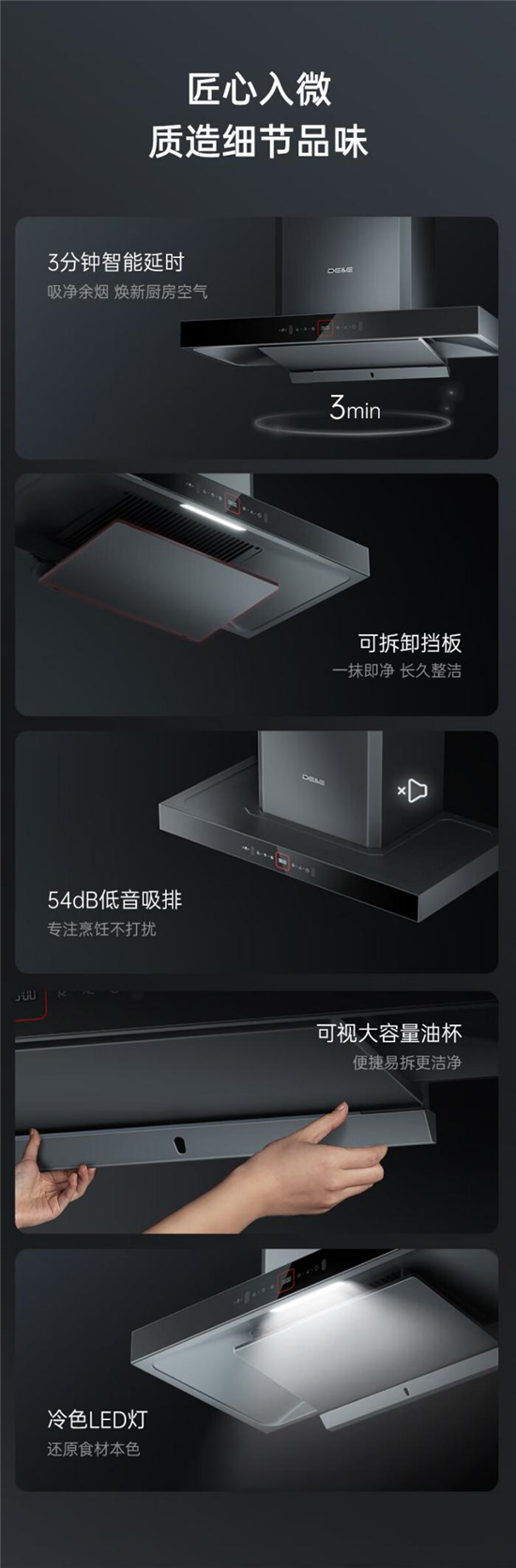 细节好的产品离不开好的设计,德意灰小T在细节设计上有很多亮点:高温涂层油网,一抹即净,清洁无忧;一体式长油杯设计,超大容量;透明可视油窗设计,储油状态一目了然;冷色双LED灯配置,分别照亮左右烹饪区域,氛围感十足;54dB超静音,远离噪音,开启厨房清净生活。