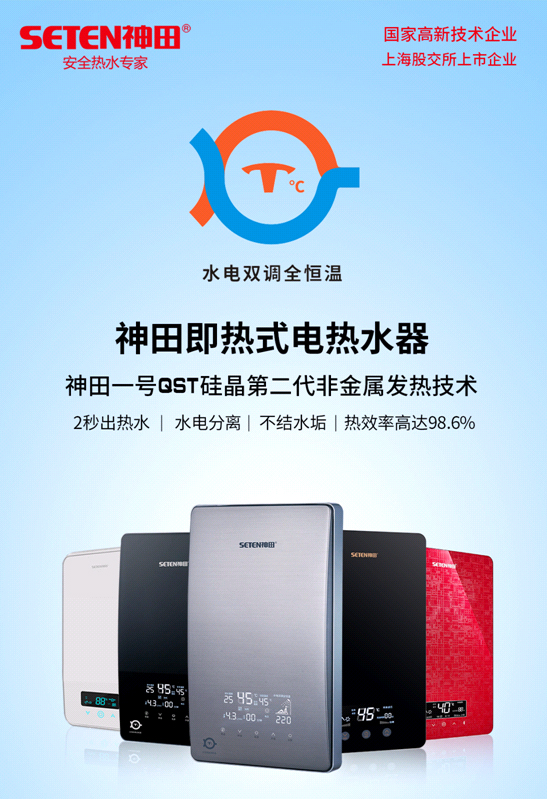 神田集团的水电双调全恒温技术,是将调流阀、水流传感器、温度传感器、可控硅、步进电机等集合在机器中,针对用电功率与水量进行自动双调节,无论外界的水温、水压、电压如何变化,都能保证出水温度达到设定的温度,恒温效果更好。