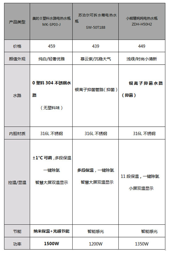 以上三款电热水瓶都是当前市面上较为受欢迎的产品,综合价值、功能特色、使用感受来看,我建议选择饮水更健康安全、功能更全面、性价比更高的美的0塑料水路电热水瓶,具体理由如下:
