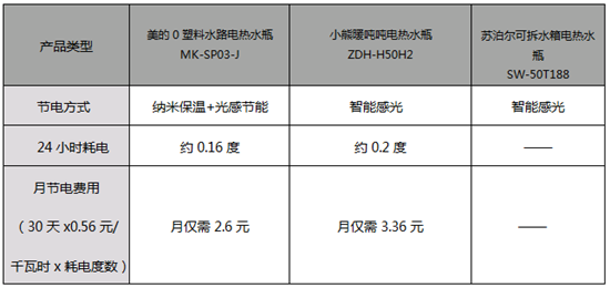 另外,三款电热水瓶虽然都配备了光感节能功能,但在节能效果上却有很大差异。我们根据美的和小熊两款产品提供的节电数据进行了测算:每天23:00——早上7点为熄灯不工作状态,相较于传统非光感节能电热水瓶,在纳米保温+光感节能双节能状态下,美的省电约49%,1整天仅耗电约0.16度;而小熊在单一的光感节能效果下,省电约33%,1整天耗电约0.2度。按照民用0.56元/千瓦时计算,美的1个月仅需0.16x30x0.56≈2.6元;小熊1个月则需要花费3.36元。