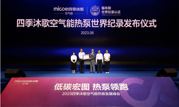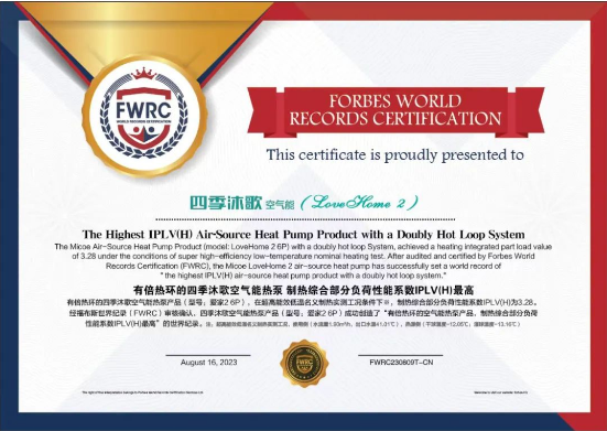 经福布斯世界纪录(FWRC)现场认证,四季沐歌空气能热泵产品(型号:爱家2 6P)成功创造了“有倍热环的空气能热泵产品,制热综合部分负荷性能系数IPLV(H)最高”的世界纪录。