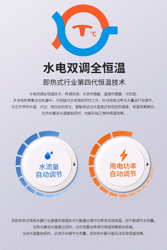 水电双调全恒温技术,可以同时自动调节用电功率与水流量,无论外界的水温、水压、电压如何变化,都能保证出水温度达到设定的温度,恒温效果更好,水量与水温也更精准。