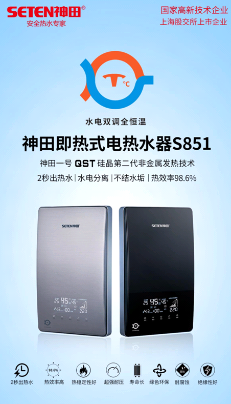 水电双调全恒温S851采用神田一号QST硅晶双芯双核6核非金属加热技术,水电分离,不结水垢,2秒出热水,热效率约98.6%;水电双调全恒温控制系统,恒温效果更好;超跑车的溜背式设计,尽显运动线条之美;超大宽屏LED荧光白屏,清晰明亮;触摸感应按键,操作灵敏;微电脑控制,防漏电,防超温、防超压、防干烧、故障自检、防脉冲干扰、防雷击等多重安全保护。