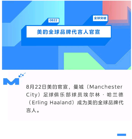 美的与曼城的成功合作始于2020年1月,本次哈兰德官宣为美的全球品牌代言人是这一合作关系的最新延展。迄今为止,双方合作的各类营销活动屡获殊荣,与之相伴的是与全球数亿粉丝和球迷的深度互动。今年5月,美的宣布与曼城足球俱乐部续约全球官方合作伙伴,开启双方第四个合作周期。