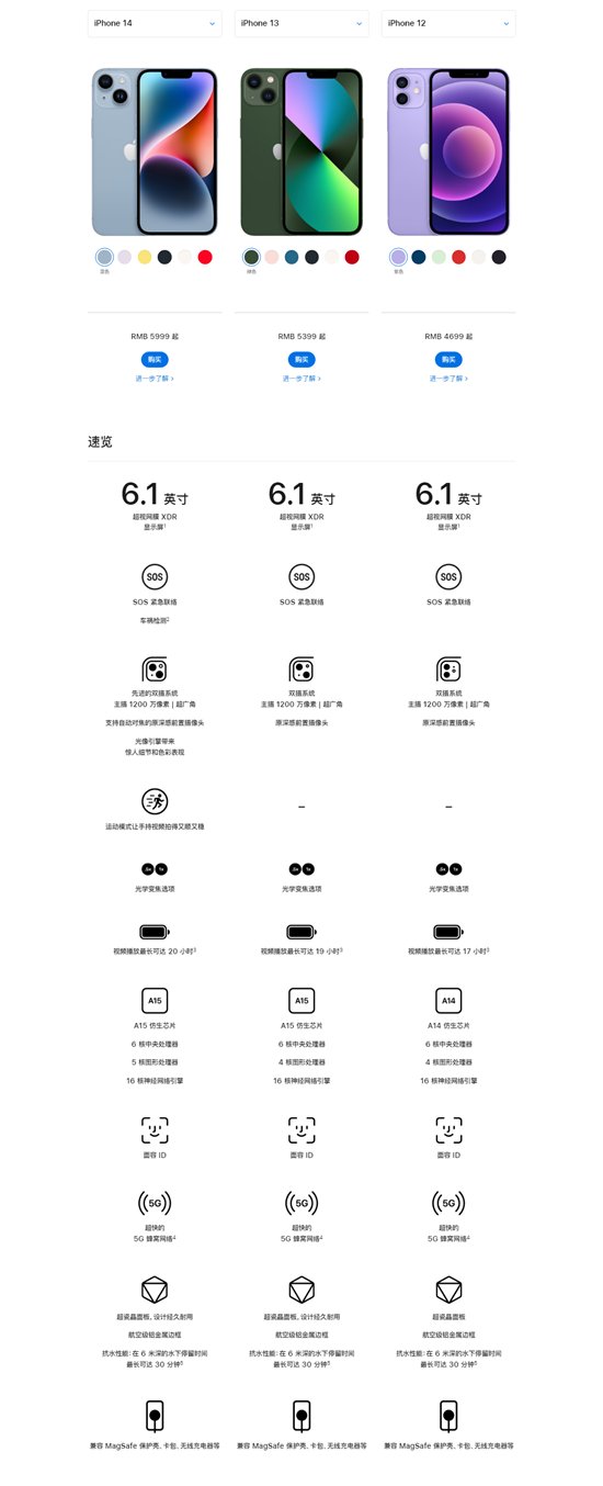 在苹果的官网上,我们打开机型比较可以看到,以iPhone12、iPhone13、iPhone14进行横向比较,最上方的速览中,基本只有摄像头有变化。同时,作为消费者能最广泛和直观地感受到的变化部分,摄像头的升级在近年也可以说是各大手机厂商们升级的首选。