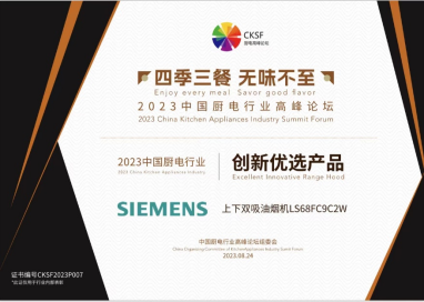 西门子上下双吸油烟机LS68FC9C2W荣获“2023中国厨电行业吸油烟机创新优选产品”