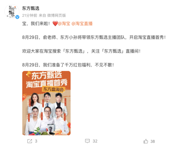 东方甄选宣布正式入驻淘宝直播,其淘宝首秀时间定为8月29日,新东方创始人俞敏洪、东方甄选CEO东方小孙带队,东方甄选众多主播将在淘宝开启全天直播。