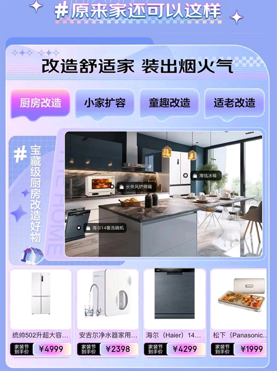 如今90后、00后成为消费主力,省心的一站式购齐家电家居产品成为消费新潮流。此次秋季家装节围绕客厅、卧室、卫生间、厨房、阳台等场景,根据不同消费者偏好,打造厨房改造、小家扩容、童趣改造、适老改造等14个趋势场景,让消费者能快速购齐家电家居产品。例如在厨房改造趋势场景中,60厘米超薄嵌入的奥马冰箱、海尔14套大容量嵌入式洗碗机、长帝家用电烤箱、安吉尔净水器、松下多功能锅等,不仅能让消费者彻底解放双手,也能为消费者打造更舒适的厨房环境。