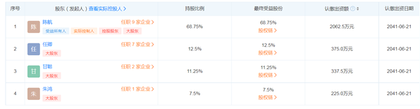 陈航在两氢一氧的持股比例为68.75%,与无招此次一同创业的核心骨干包括:原阿里钉钉副总裁任卿(花名“易统”)、原阿里钉钉市场部负责人甘聪、以及原阿里钉钉首席架构师、CTO朱鸿(花名“一粟”),分别在两氢一氧持股12.5%、11.25%、7.5%。