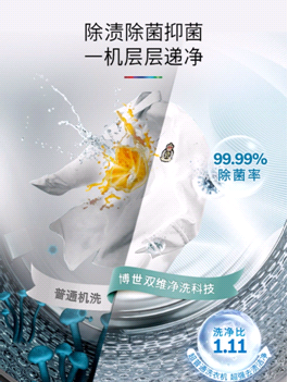 2.经第三方检测机构依据QB/T 5132-2017对博世XQG100-WNC854A50W型全自动滚筒式洗衣干衣机洗烘45’程序进行检测,结果显示可有效去除衣物上99.99%以上的大肠埃希氏菌和金黄色葡萄球菌。(报告编号:WXq-23-50112)