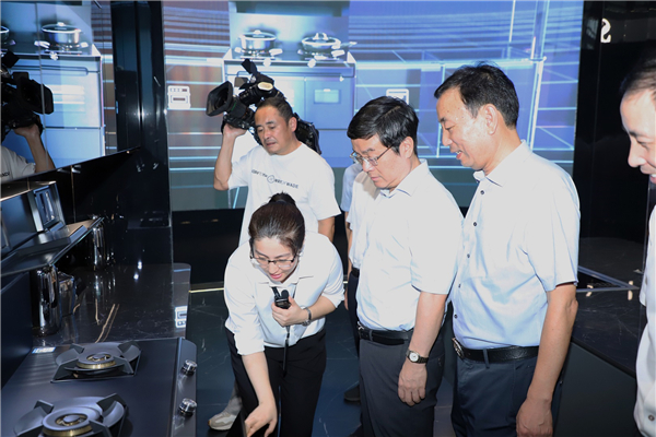 领导们不时驻足停留,就企业研发、生产现状同孙董事长展开热切交流。孙董事长介绍道,作为行业内唯一一家获得了“浙江省人民政府质量奖”的企业,亿田致力于推动科技迭代、产品进化、产业进步。自成立以来,亿田始终深耕厨电领域,以创新驱动发展,专注专业解决国人的厨房难题;以科技拓宽维度,全矩阵尖品全方位满足消费者需求,成功走出一条无烟、无害、无人厨房的跃升之路。