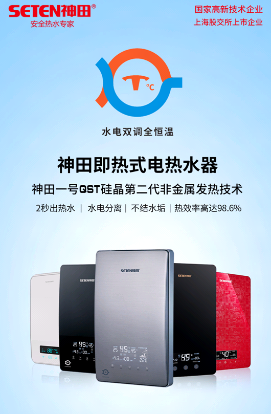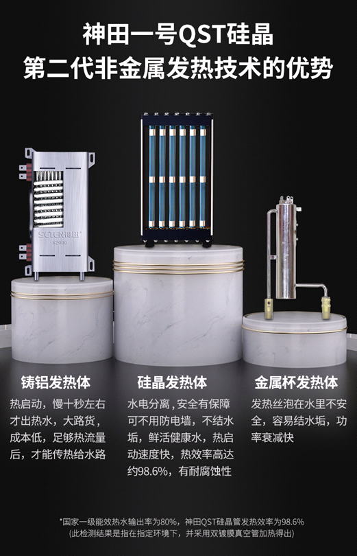 第一,水电分离,不结水垢,水质差的地区也能使用,综合性能更优。神田一号QST硅晶第二代非金属发热技术,水电分离,不结水垢,热启动快,2秒出热水,8秒可以实现恒温,热效率高达98.6%,耐腐蚀,稳定性好。相对而言,铸铝发热体的热启动会慢,达到恒温效果可能要到20秒以上,热效率也更低。