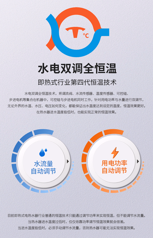 即热式电热水器行业经过几十年的发展,经历了档位调节、无级调温、智能变频恒温、水电双调全恒温技术这四个阶段。目前变频恒温技术基本上是行业的普及型技术,水电双调全恒温技术因为成本高,有相当高的技术含量,所以很多厂家暂时不具备开发此类型产品的能力。