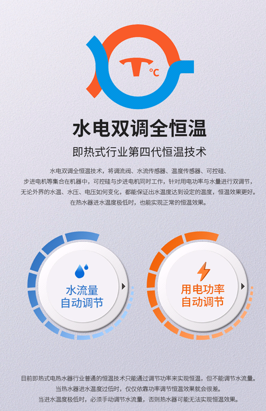 李卫泽介绍,水电双调全恒温技术,是指热水器可以自动调节用电功率,自动调节用水流量,无论外界的水温、水压、电压如何变化,都能保证出水温度达到设定的温度,恒温效果更好,是可以不用调流阀的热水器。