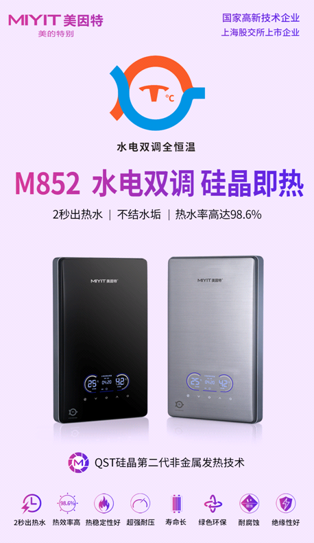 M852符合美因特“时尚的产品,时尚的技术、时尚的设计”的经营理念,硅晶加热+水电双调恒温的产品平台,将会成为即热式电热水器行业的经典款产品!