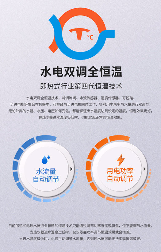 李卫泽介绍,水电双调全恒温技术,是指热水器可以自动调节用电功率,自动调节用水流量,无论外界的水温、水压、电压如何变化,都能保证出水温度达到设定的温度,恒温效果更好。