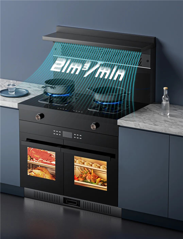 排烟能力同样是构建无烟厨房的关键,培恩M5集成灶加持智慧变频控制系统,通过智能数字算法,实现自动巡航增压,根据烟道压力大小自动调节风量,最高可提供1000Pa风压,即使在排烟高峰期,也能强力吸排不倒灌,肆意爆炒,不受油烟困扰。