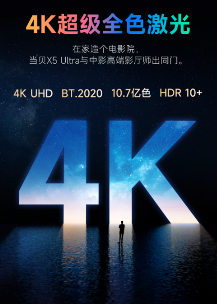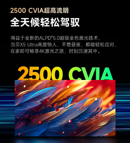在亮度上,当贝X5 Ultra还能达到2500 CVIA流明,在当前市场遥遥领先,这种高亮度使得画面更加清晰,让用户无论昼夜都可以轻松获得沉浸感极强的4K激光体验。