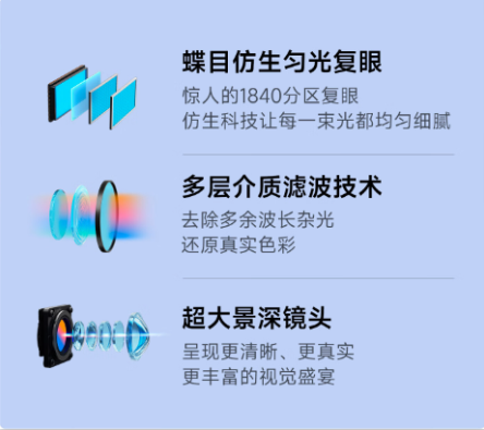 此外,当贝X5 Ultra超级全色激光投影还加入蝶目仿生匀光复眼技术,达到惊人的1840分区复眼,仿生科技让每一束光都均匀细腻;多层截止滤波技术,去除多余波长杂光,还原真实色彩;搭配超大景深镜头,呈现更清晰、更真实、更丰富的视觉盛宴。