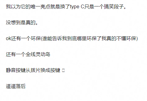 当然,总结下来就四个字:遥遥领先。 当天另一场发布会苹果,普遍收到的评价则是:怒其不争。除了游戏画面有了明显的提升,其他所谓的提升都非常平庸。