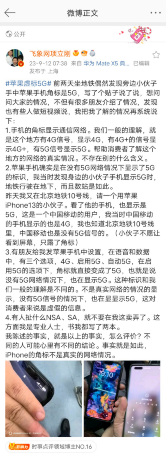 其次,信号疑造假。微博自媒体人发现:没有任何一家5G运营商在北京地铁运营5G,但苹果手机会显示5G信号,疑似虚标。