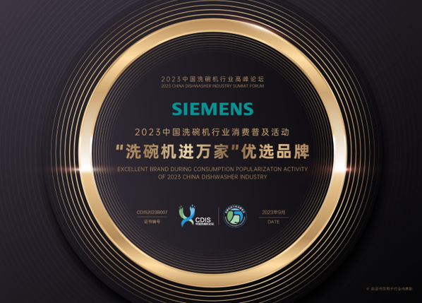 西门子家电荣获“2023中国洗碗机行业消费普及活动‘洗碗机进万家’优选品牌”