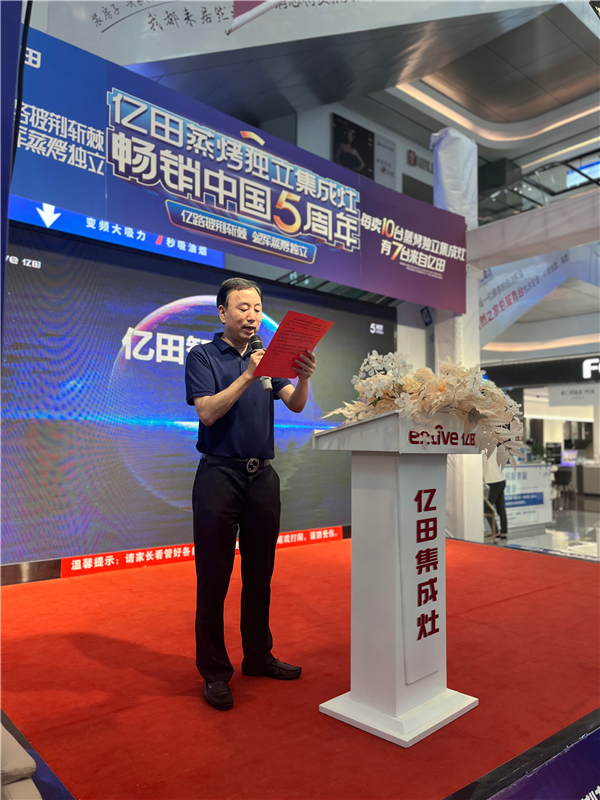 发布会开场,孙伟勇董事长上台致辞。孙董讲到,蒸烤独立集成灶的开创,印证着亿田深耕厨电二十载的厚积薄发,而亿田蒸烤独立集成灶畅销中国五周年,印证着深度洞察用户需求后的成功战略擘画。未来,亿田将继续以“蒸烤独立集成灶品类”为核心,“为亿万家庭构建健康、智能、开放的集成厨房!”
