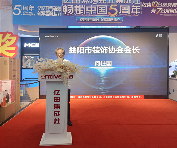 益阳市装饰协会会长何柱国受邀上台致辞。他对于亿田蒸烤独立集成灶品类的开拓创新表示十分肯定,相信亿田的匠心智造,定能持续推动中国厨电改革,引领行业发展新浪潮!