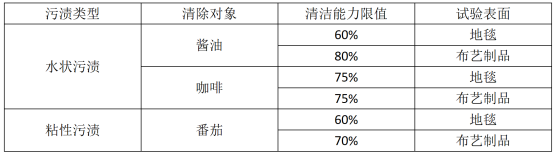 然而,由于业内没有统一的试验方法不一,导致不同企业在宣传布艺清洗机的清洁效果时标准不同,甚至有的企业出现虚假、夸大宣传,误导了消费者。因此,经充分的调查、研究和反复的验证,并且充分考虑消费者家庭使用场景,布艺清洗机标准工作组创新性地提出了有代表性、可复现性强的试验方法。同时,在该测试方式下,布艺清洗机标准还规定了产品的清洁能力限值,详见表1。