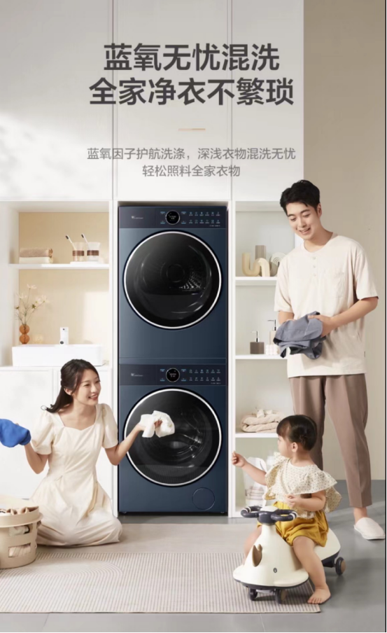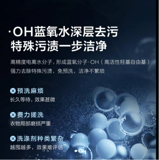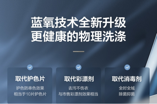 此前,2021年家电头部品牌小天鹅推出了超薄全嵌本色洗烘套装,搭载了蓝氧特渍净技术,利用羟基自由基给衣服进行消毒除菌、去除特殊污渍,从根本上降解有机污染物,同时蓝氧分子还可以吸附颜料分子,起到防串色效果。