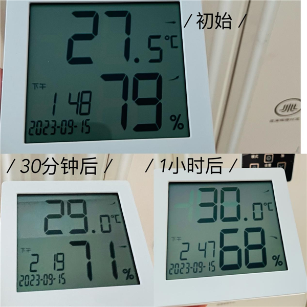 为了验证整个房间的取暖效果,通过在不同时间的温度的变化来评测,初始温度为27.5℃。半小时过后,温度为29.0℃,一小时候后,温度为30.0℃。