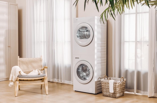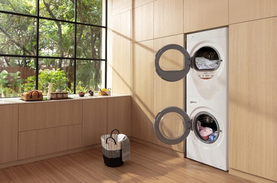 洗烘套装,在外形设计上由一台洗衣机以及一台烘干机独立组成,一般使用热泵式烘干,烘干效果更强,但由于是两台机器组合而成,因此需要两套进水和排水系统,以及两套电源,同时视觉的整体性较差,并且一般机身较大较占空间,市面上洗烘套装的价格也相对更高。