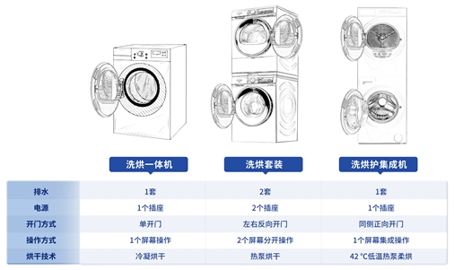 正因此,同时带有洗烘功能的洗衣机逐渐受到消费者的青睐,目前市面上常见的带有烘干功能的洗衣机,主要有三种:洗烘一体机、洗烘套装以及洗烘集成机。要想获得最适合自身且更完美的洗烘解决方案,首先需要明晰产品差异。
