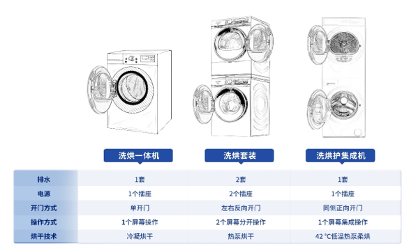 洗烘套装,在外形设计上由一台洗衣机以及一台烘干机独立组成,一般使用热泵式烘干,烘干效果更强,但由于是两台机器组合而成,因此需要两套进水和排水系统,以及两套电源,同时视觉的整体性较差,并且一般机身较大较占空间,市面上洗烘套装的价格也相对更高。