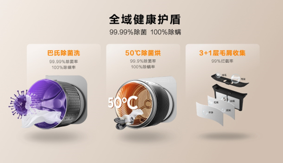 除了洗、烘、护之类,TCL双子舱T10在“健康”方面也是出类拔萃,配置了巴氏除菌洗、50℃高温除菌烘、3+1层毛屑收集等众多健康功能,达到99.9%除菌率、100%除螨率和99%拦截率。