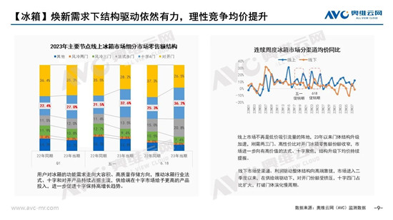 据奥维云网(AVC)监测数据,23年1-37周线上市场小冷冻柜市场累计零售量285.5万台,同比下滑3.2%,大冷冻柜累计销量79.1万台,同比增长0.5%,考虑到去年同期高基数,今年的需求状态在预期内。从供给端来看,企业货源储备充足,避免了去年同期无货可买的状态,但目前存在高强度价格竞争,线上小冷冻柜年累计均价881元,同比下滑4.2%,大冷冻柜均价1510元,同比下滑1.9%,在持续的价格竞争下,结构下行、零售额规模缩减。双节促销期要要警惕过渡内卷带来的价值破坏。