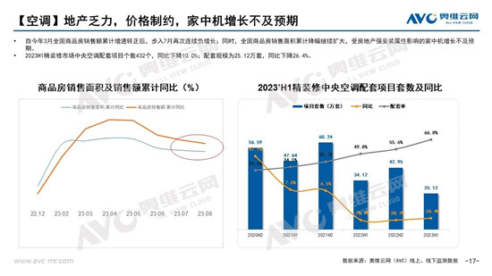 自今年3月全国商品房销售额累计增速转正后,步入7月再次连续负增长;同时,全国商品房销售面积累计降幅继续扩大。受房地产强安装属性影响的家中机增长不及预期,同时中央空调的高价格特性也是制约消费者选择购买的因素之一。根据奥维云网(AVC)监测数据,2023H1精装修市场中央空调配套项目个数432个,同比下降10.0%;配套规模为25.12万套,同比下降26.4%。