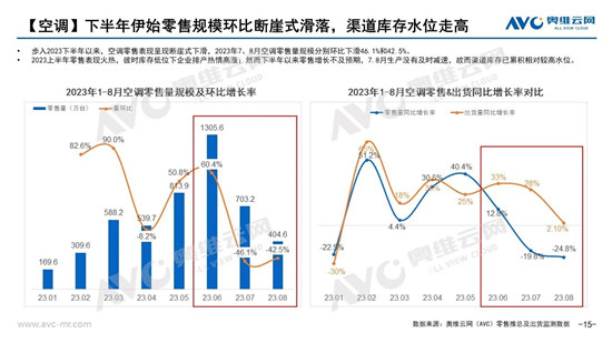 受上半年需求释放力度强劲、同期基数较高、以及渠道库存水平走高等影响,进入2023下半年以来,空调零售市场表现急转直下,呈现断崖式下滑,根据奥维云网(AVC)推总数据,8月份零售量和零售额分别下滑24.8%和23.3%。但结合7-8月渠道库存走高,市场在经过8月大回调之后,基于主动去库存逻辑,9月市场规模会略有回复,国庆期间会呈现复苏迹象。同时今年国庆节假期从中秋节开始,双节叠加的集聚效应下各地区纷纷发放消费券,结合京东、五星、三联等线下渠道布局动作频频,零售主战场向线下和企业自有渠道转移,国庆期间同期低基数叠加线下渠道周转压力,线下市场将助力大盘增长。