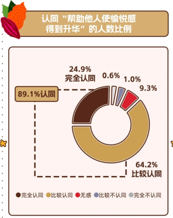 有近八成的人认为精神愉悦高于物质愉悦,年轻人让自己愉悦的方式也变得越来越多样化,沈奕斐指出,有一项洞察最为特别,“近八成受访者认为,助人行为所带来的愉悦感可以持续较长时间,达到数天、数月甚至数年。这也说明,能够带来持久愉悦感的方式,常常是在我们帮助他人和取悦自己的过程中所获得的。”