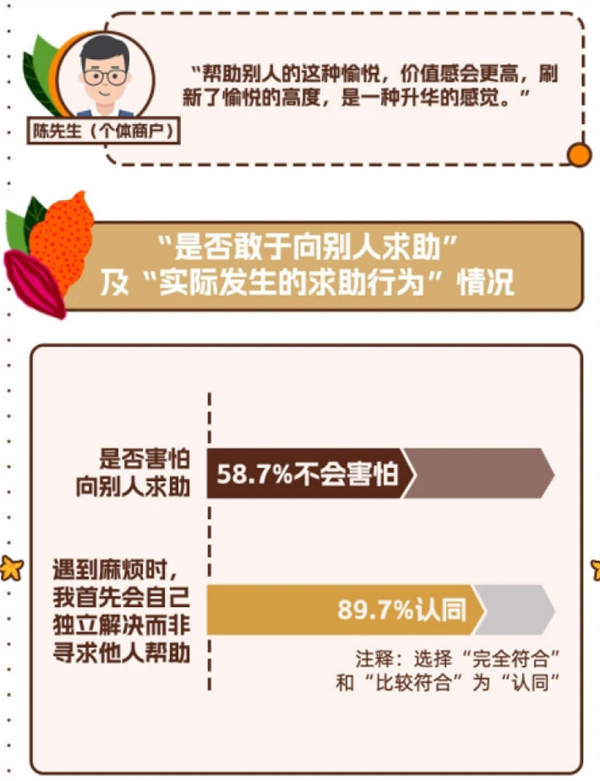 但与此同时,近九成受访者在遇到困难时更倾向自己独立解决而非向他人求助。腾讯新闻谷雨工作室编辑总监赵涵漠指出,“跟这个数据能够作为一个对照来看有一个非常有趣的数据,当人们发现周围有人需要帮助情况时,即便对方还没有开始求助,将近70%的人都会主动去提供帮助。”