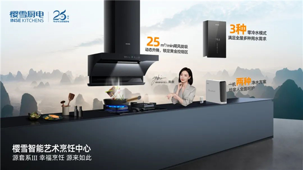 在技术不断革新,产品线不断完善的常态下,厨房电器智能化的程度越来越高。此次樱雪带来全新套系厨电系列—源套系Ⅲ,以高颜值、高性能的产品矩阵为用户带来一整套功能完善的厨房问题解决方案!樱雪厨房管家烟机2305以直流变频电机搭载智能升降系统,锁定350mm黄金拢烟区,同时搭配智能烟灶联动、挥手智控系统,拥有25m3/min变频鲸吸,1100Pa强势静压,可有效解决厨房油烟问题,享受清新的烹饪环境。另外套系厨电还涵盖5.2kW大火力、65%一级能效的防干烧灶具2102、18L智能零冷水2202、1200G大通量、6年长效反渗透滤芯双出水净水器2206、12套大容量设计洗碗机2302。