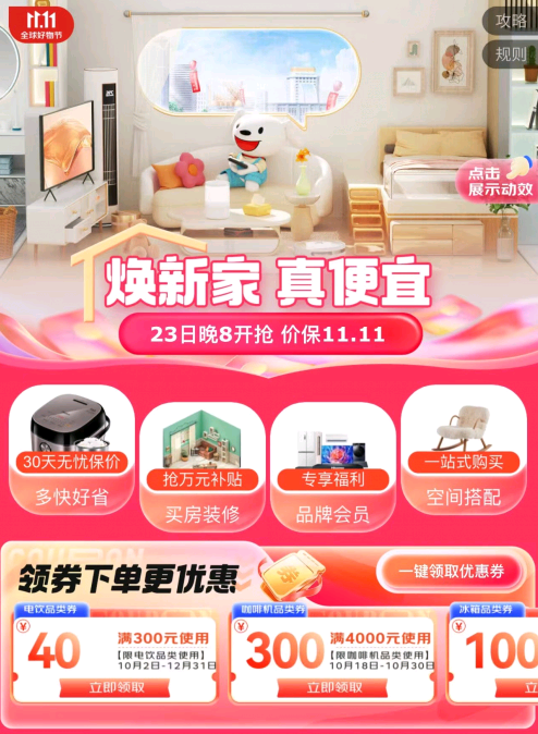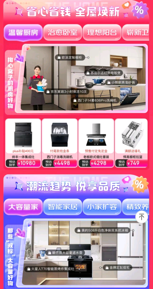 除了超值爆品,今年11.11京东家电家居聚焦极简风、奶油风、原木风三大风格化家装场景,围绕客厅、厨房、卫浴、卧室、阳台五大空间,以及大容量家、智能家居、小家扩容、精致养生等潮流趋势,打通商品品类,推出面向不同家装风格的产品组合,让消费者根据自身喜好随意挑选,既不用担心风格不匹配,还能直接抄作业享受到京东11.11的优惠福利。