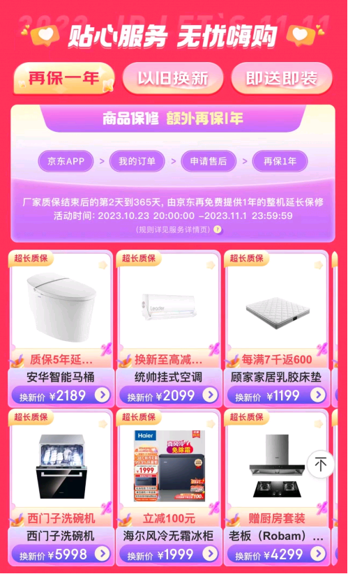 此外,针对电视、洗衣机、冰箱等家电品类,京东提供即送即装服务,针对沙发类、床类、床垫、柜类等家居品类提供送装一体的服务。同时,即日起至11月1日期间,在京东购买冰箱、洗衣机、厨卫大电、电视、空调、视听影音、家具建材、环境电器、清洁电器(不含洗地机、扫地机品类)等自营商品,还可在厂家质保基础上额外再保1年服务,让售后保障更全面。