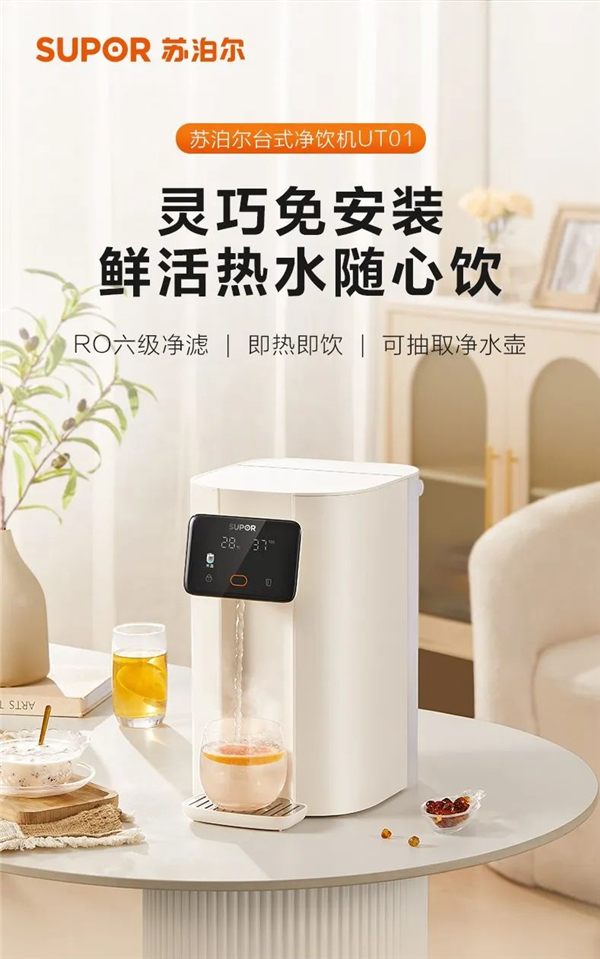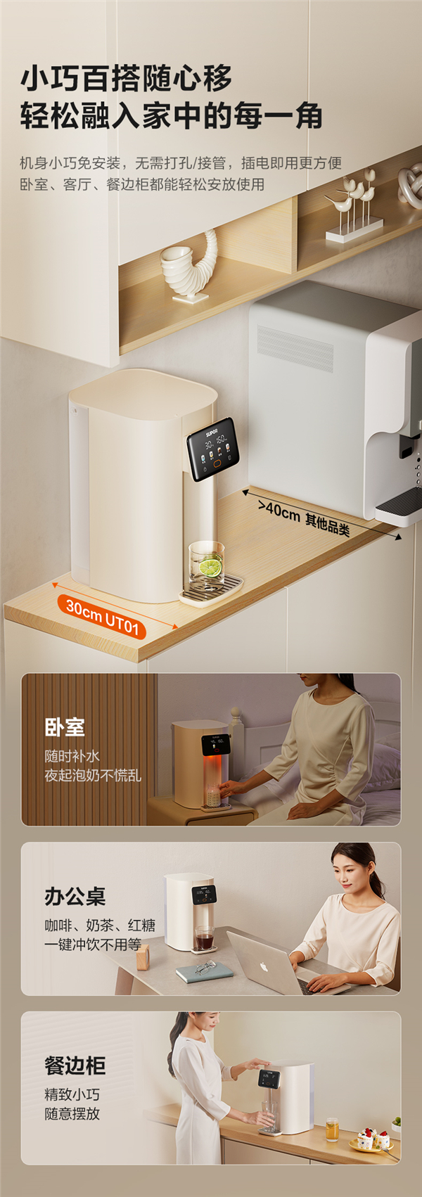 喝茶讲究的心境,可以在书房看书喝,也可以在卧室的飘窗上喝,还可以在客厅和朋友们畅谈时喝。想要随时喝上干净放心的纯净水,不如备一台苏泊尔净饮机UT01,随取随用。苏泊尔净饮机UT01整体体积小巧,不需要安装、用起来方便、不占地儿,相比起身长40cm以上的同品类产品,苏泊尔净饮机UT01仅30cm的身长更胜一筹,如同一个小巧的抱枕一样精致,放在任何一个需要喝水、用水方便的位置都OK。